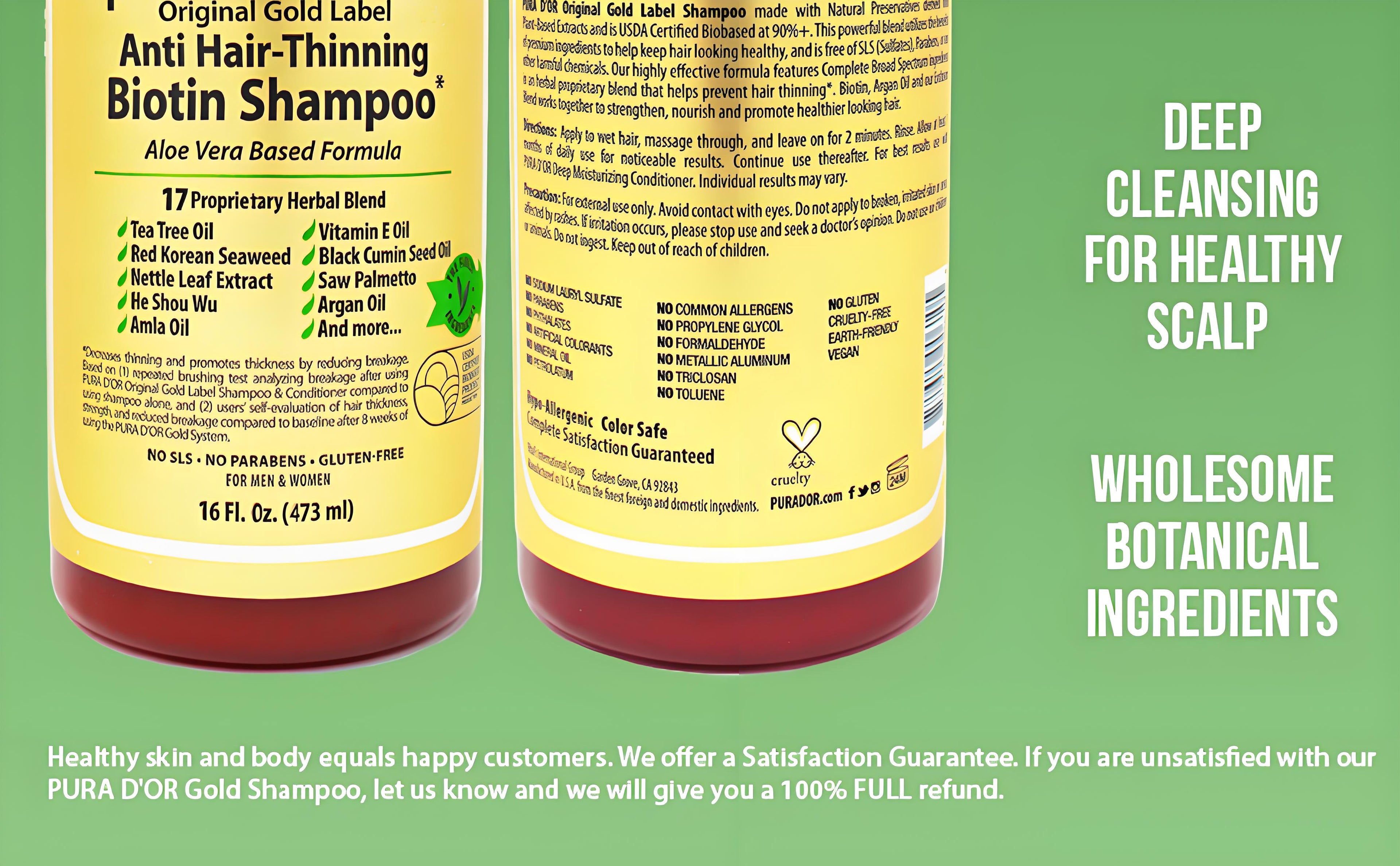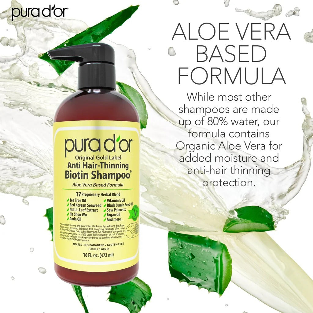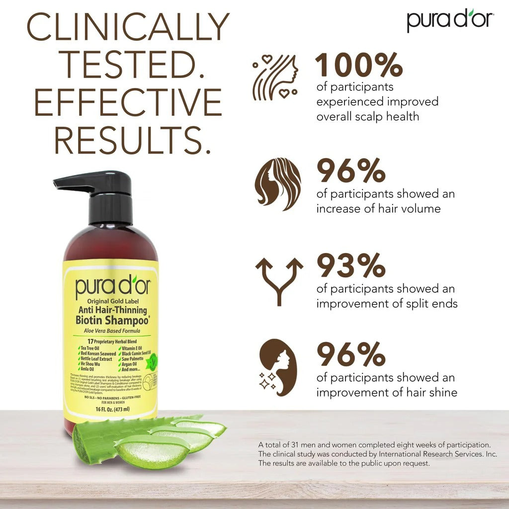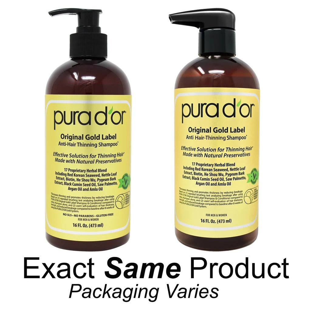PURA D'OR Original Gold Label Shampoo is Clinically tested formula with effective results to help reduce hair thinning due to breakage, increase volume, strength and shine.* Our proprietary blend of 17 key active ingredients, organic extracts, and essential nutrients nourish hair to boost strength and resist breakage. Packed with a powerful blend of Biotin, Nettle, Pumpkin Seed, and Black Cumin Seed Oil to increase volume and thicken hair. Free from harsh chemicals, environmentally responsible, hypo-allergenic, vegan, and cruelty free.